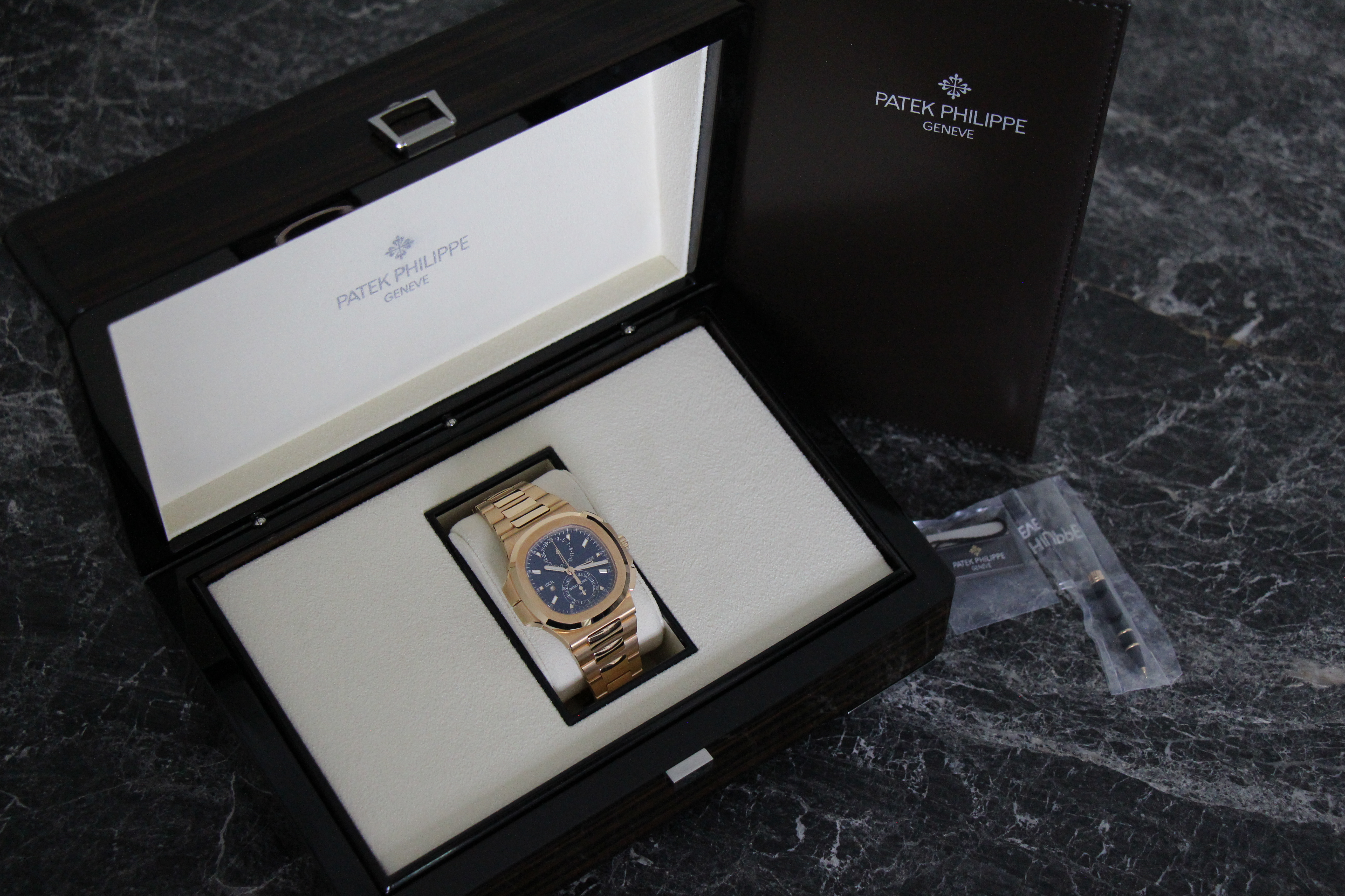 Patek Philippe Nautilus Travel Time Chronograph Ref. 5990/1R-001, fra juni 2023. Uret har Patek Philippe garanti verden over til juni 2025. Uret er fabriksnyt.