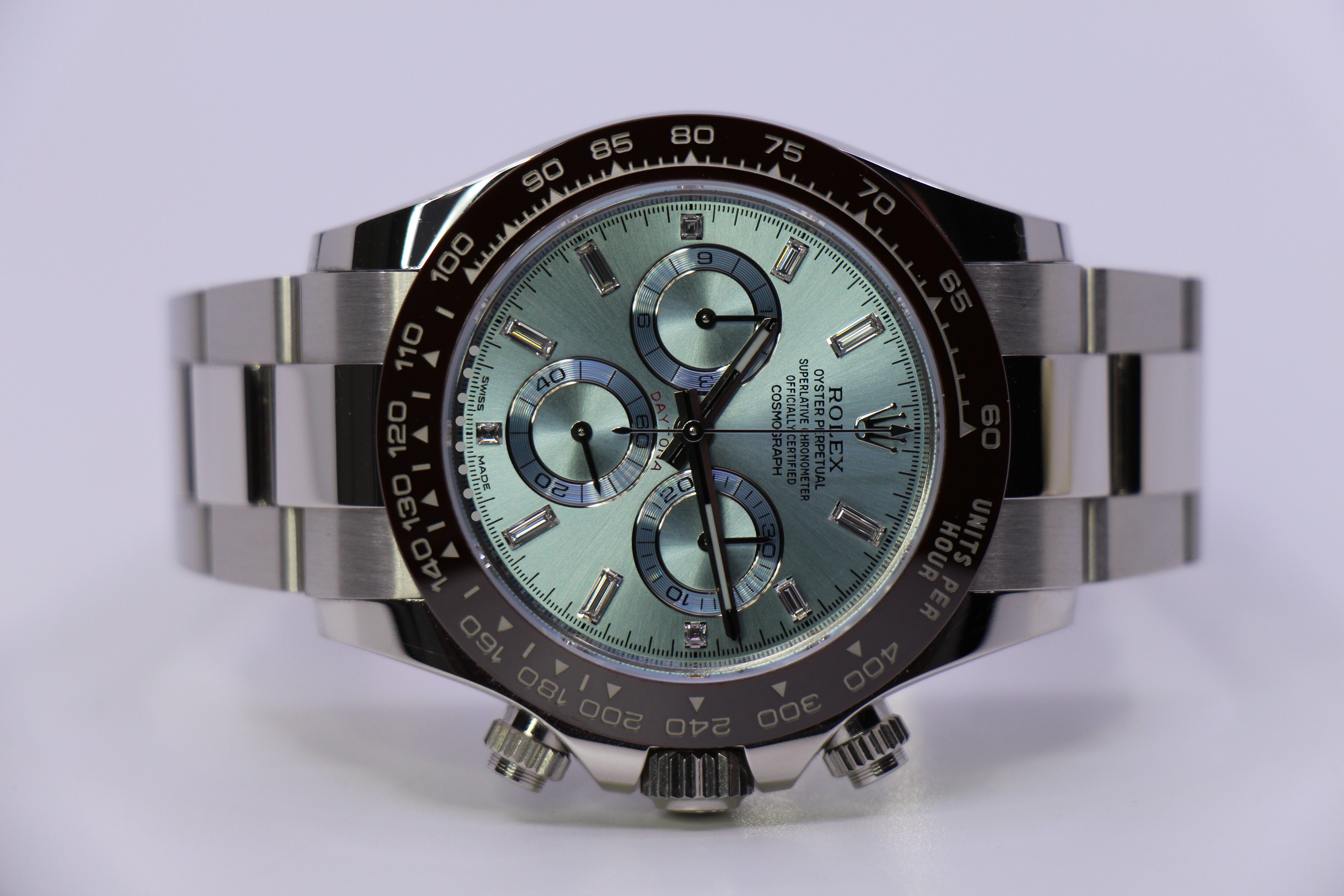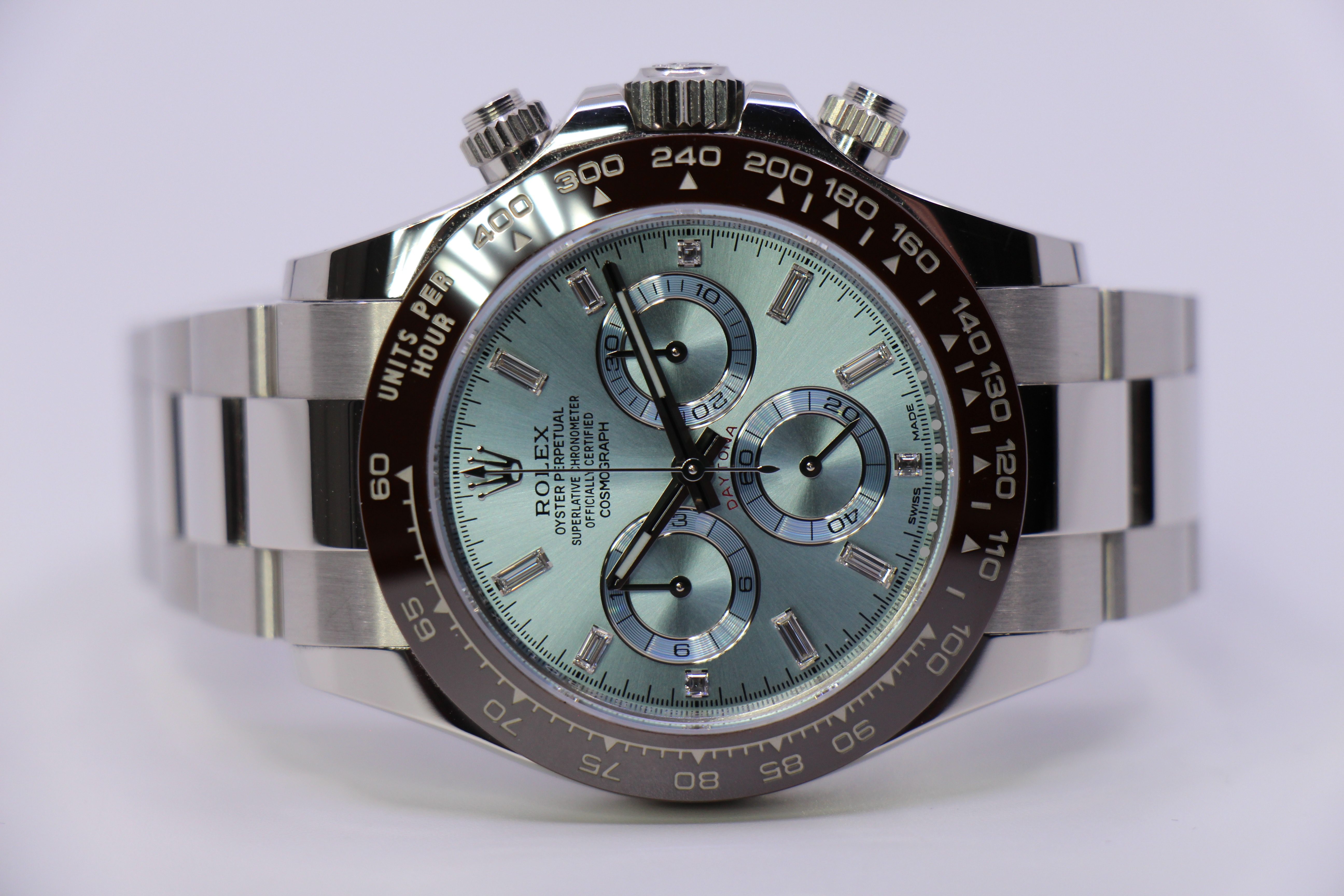 Denne model markerede 50-årsjubilæet for Daytona-serien og blev introduceret som den første Daytona i 950 platin, den mest ædle og tunge af alle metaller i Rolex’ sortiment. Her præsenteres den i den mest efterspurgte variant, med baguette-slebne diamanter som timemarkeringer på den ikoniske isblå skive. Kombinationen af den kolde platin og de varme, lysreflekterende diamanter skaber et super elegant, og sportslig udtryk.