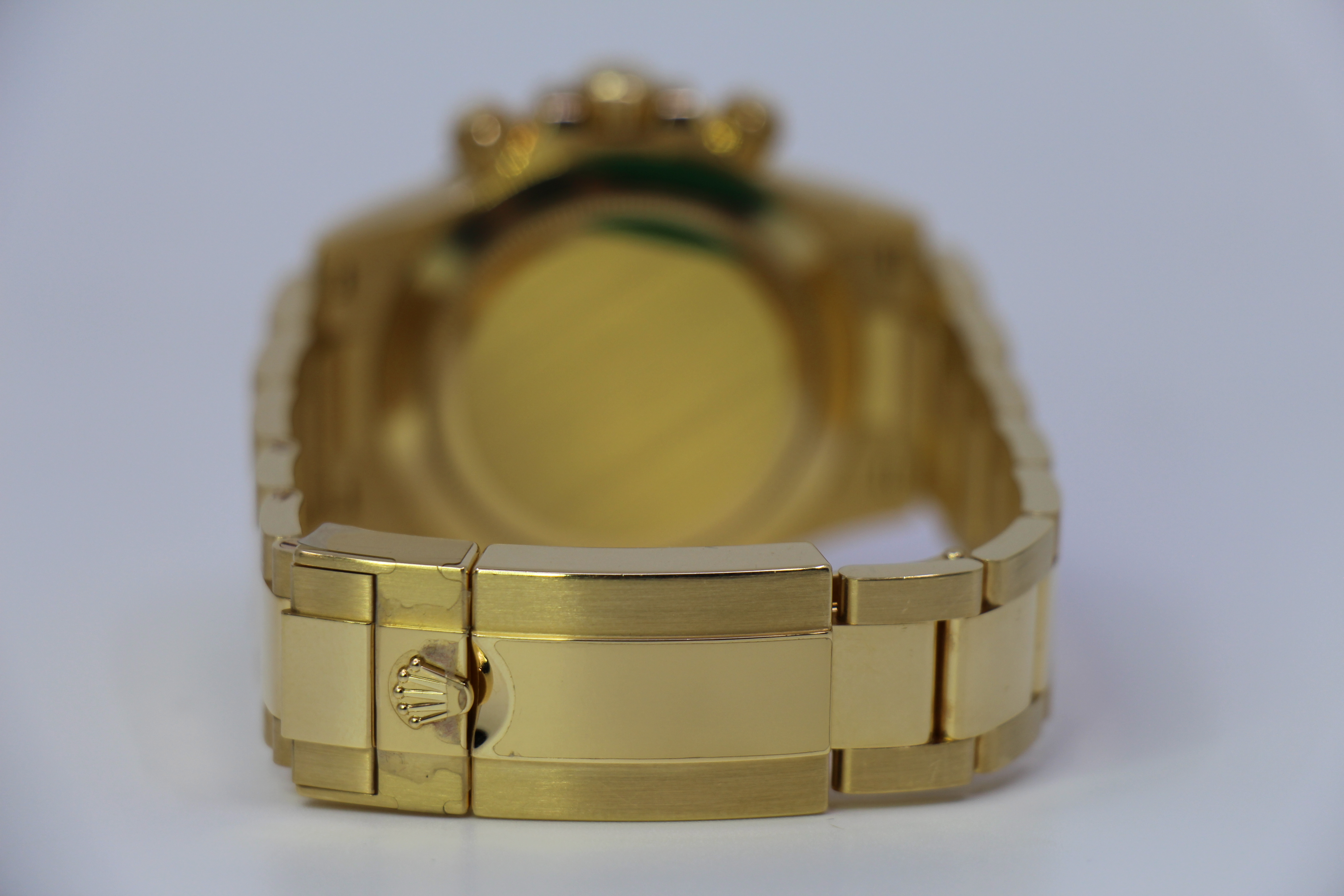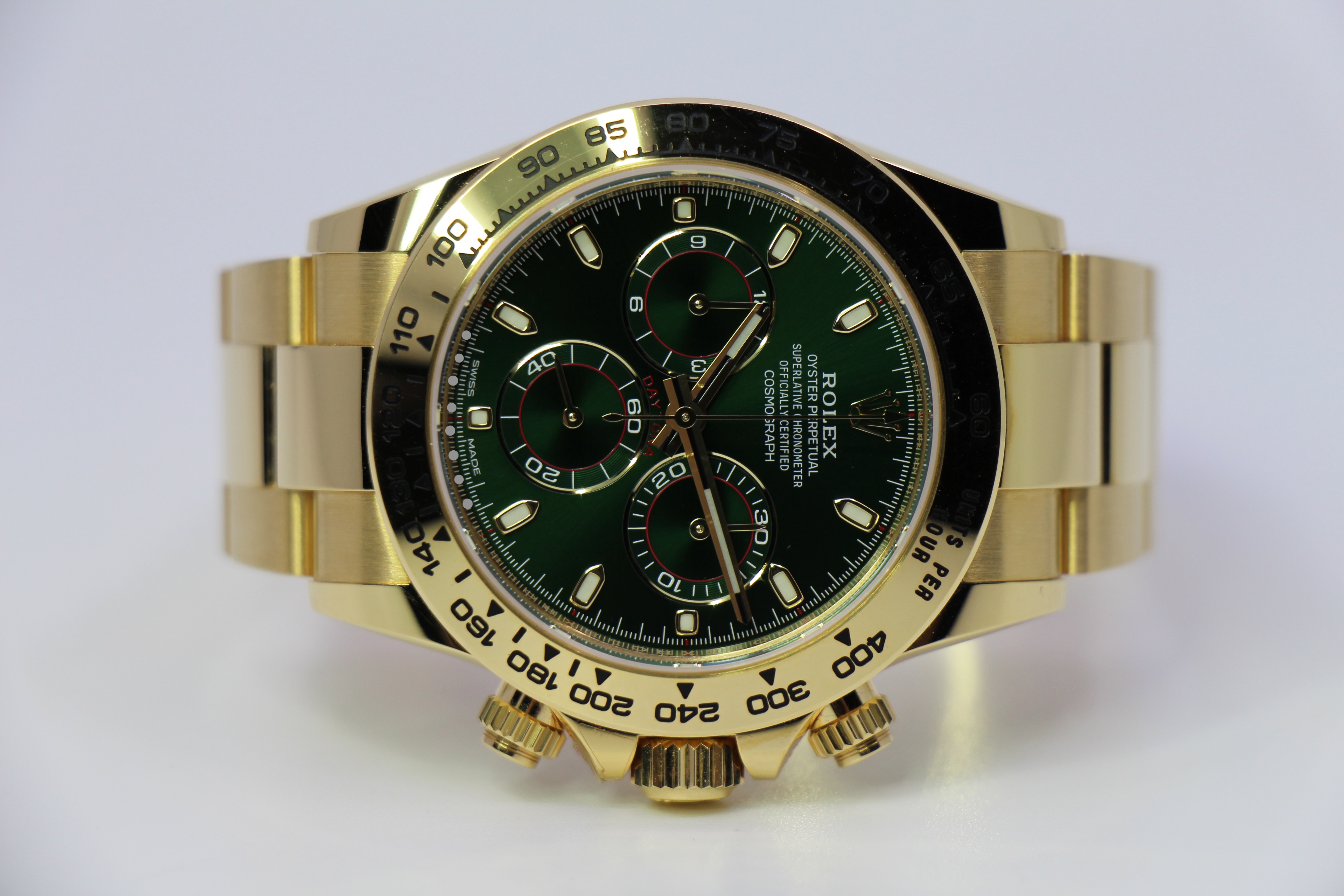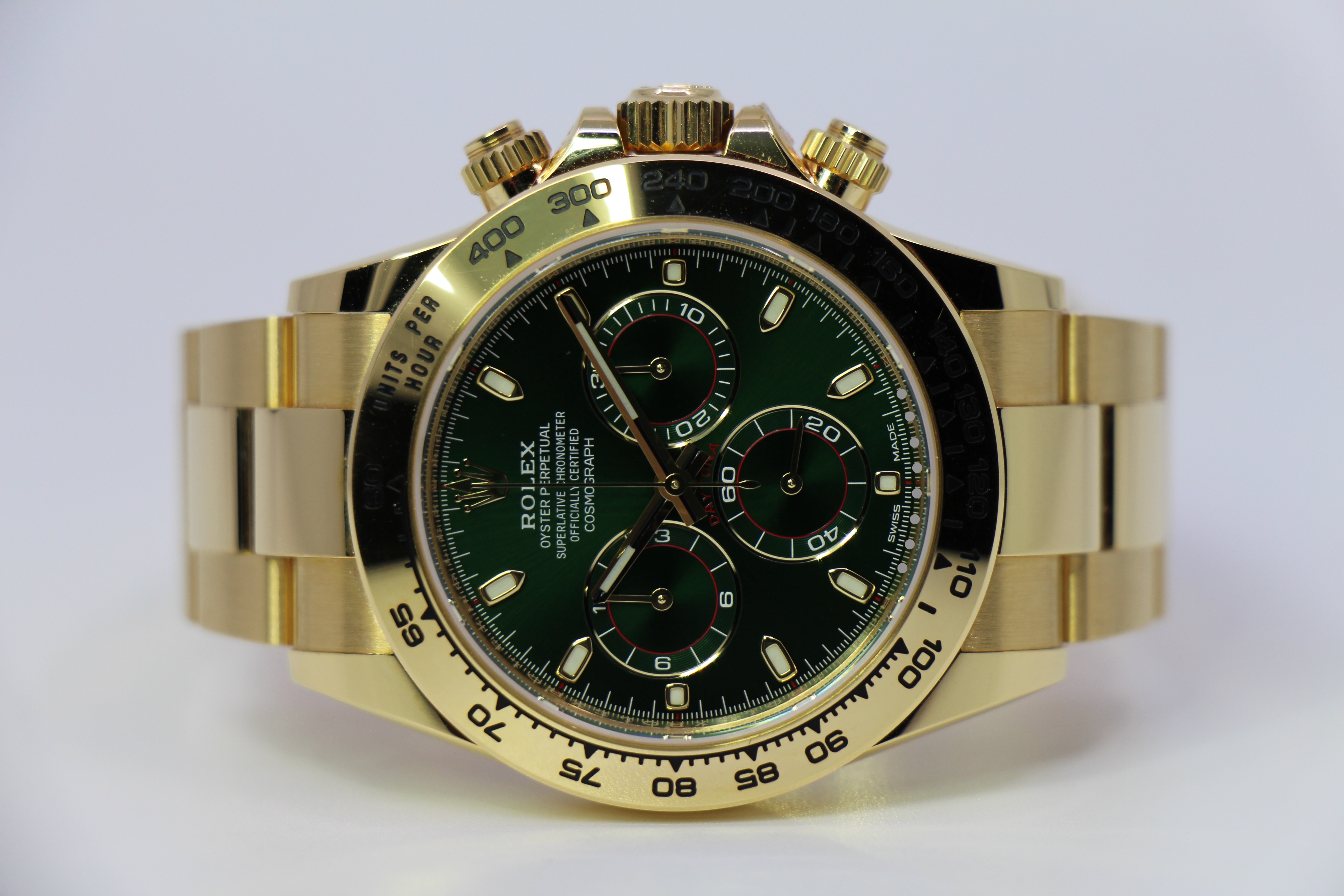 Rolex’ Daytona kommer her i guld. Uret kommer med den eftertragtede grønne skive, som også er kaldet “money dial”.