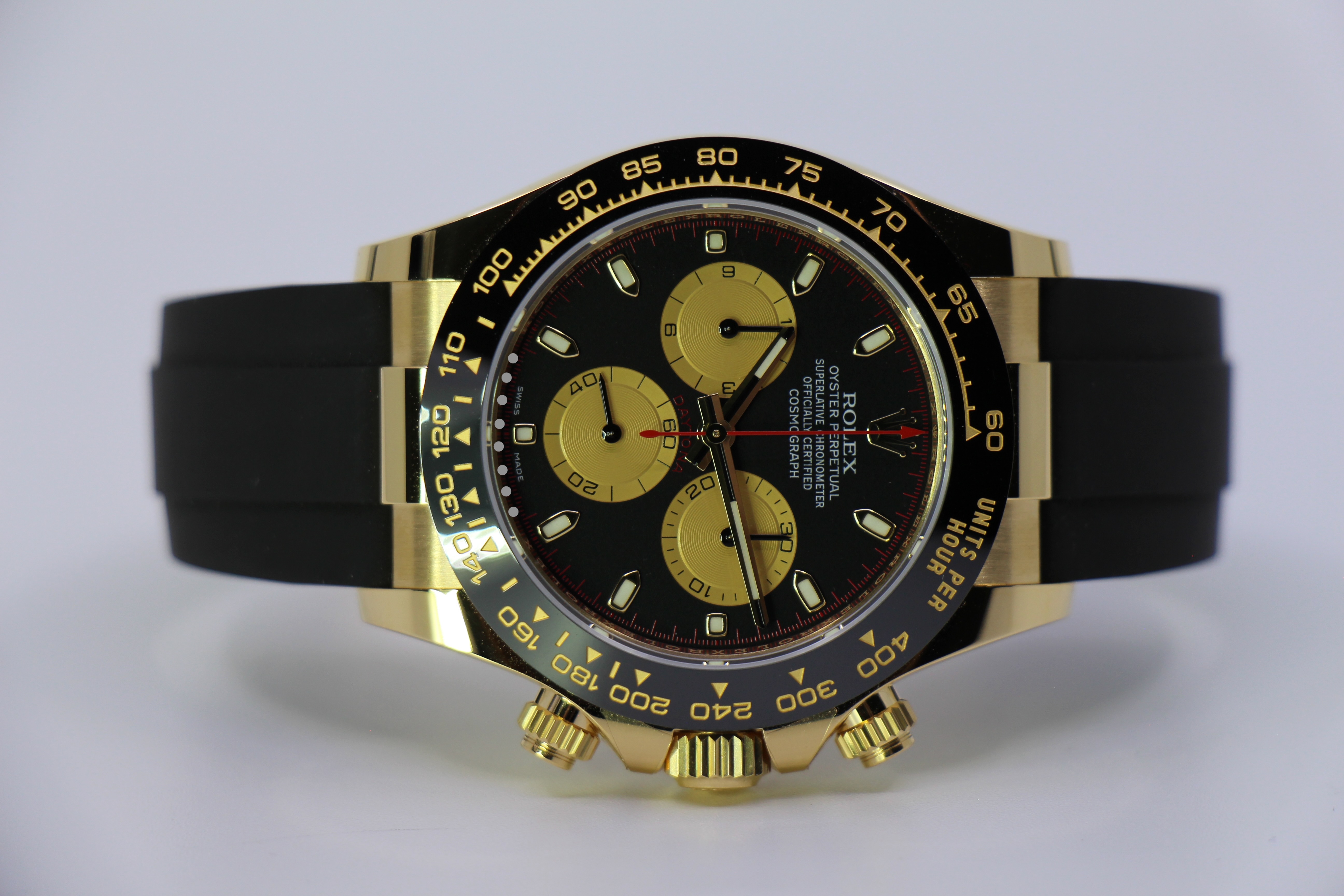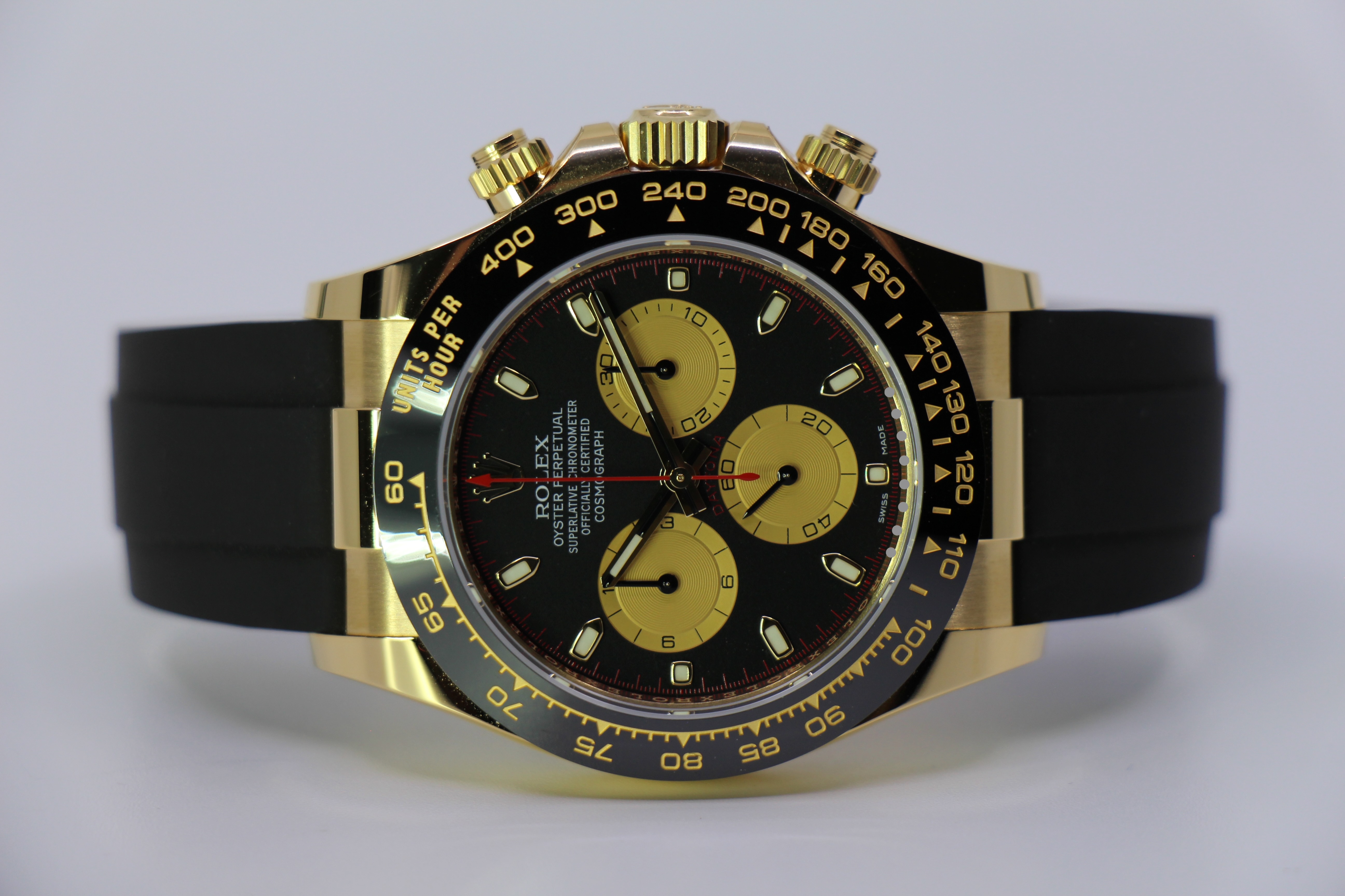 Rolex’ Daytona kommer her i guld på den populære oysterflex rem. Uret kommer med den eftertragtede “Paul Newman” skive.