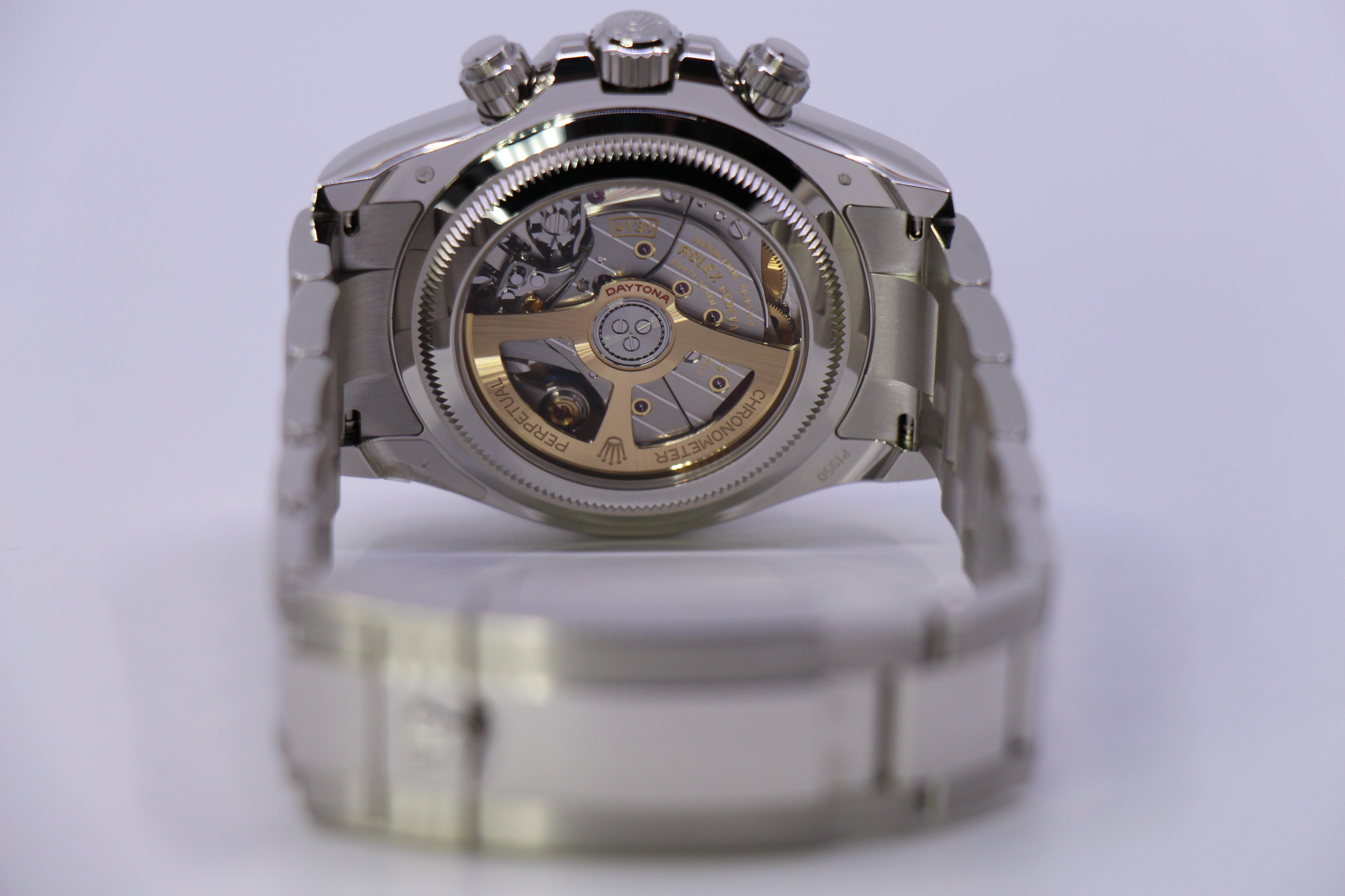 Uret kommer med det avancerede Caliber 4131, den nyeste generation af Rolex’ egen kronograf-kaliber med forbedret effektivitet, flottere finish og en gangreserve på ca. 72 timer. Urværket kan betragtes igennem den åbne glas-bagkasse.