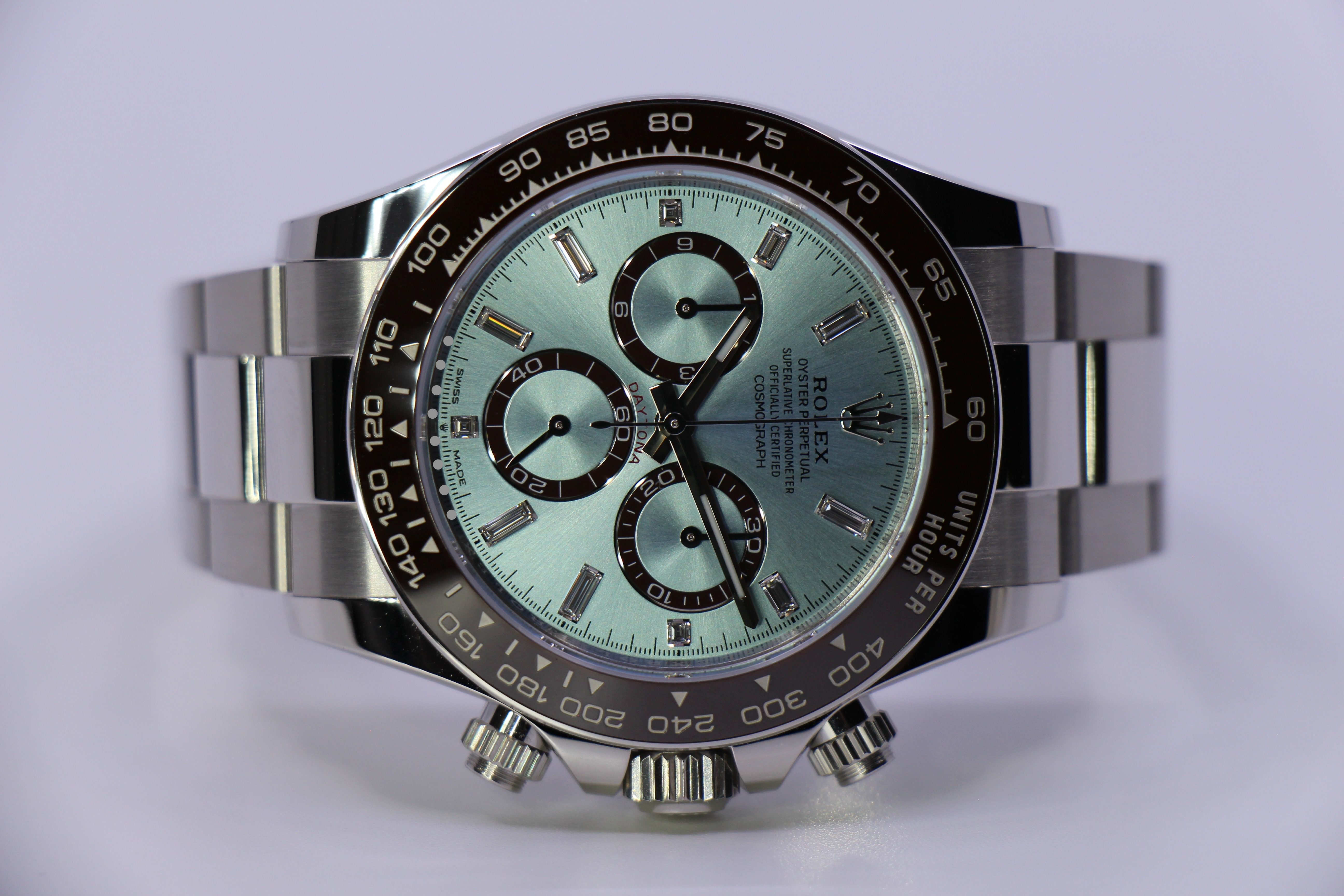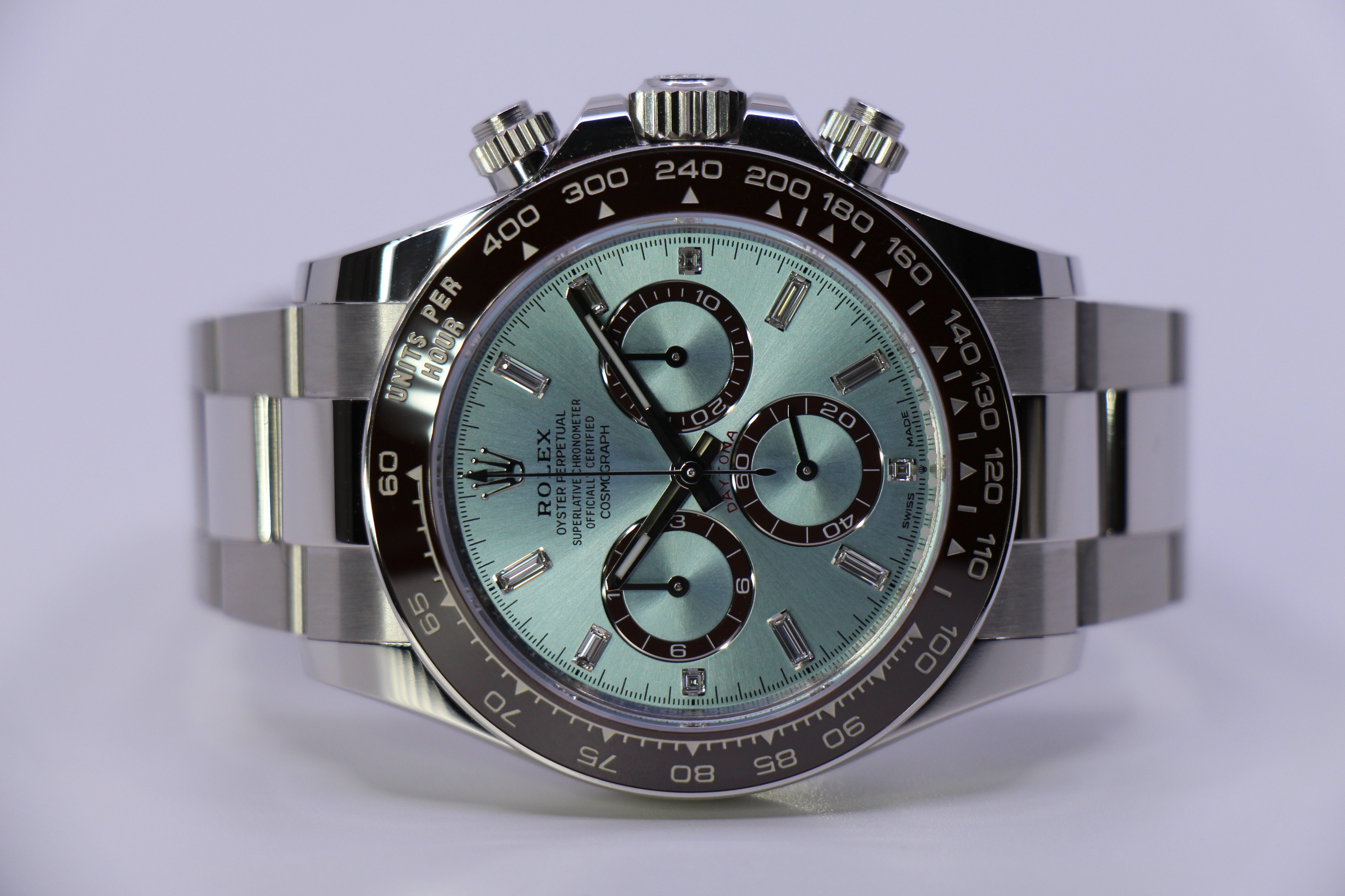 Denne udgave er udsmykket med baguette-slebne diamantmarkeringer, der giver uret et diskret, men markant præg af luksus. Den brune Cerachrom-keramiske tachymeter-lynette skaber en smuk kontrast til den kølige platin og det lyseblå skær på skiven.