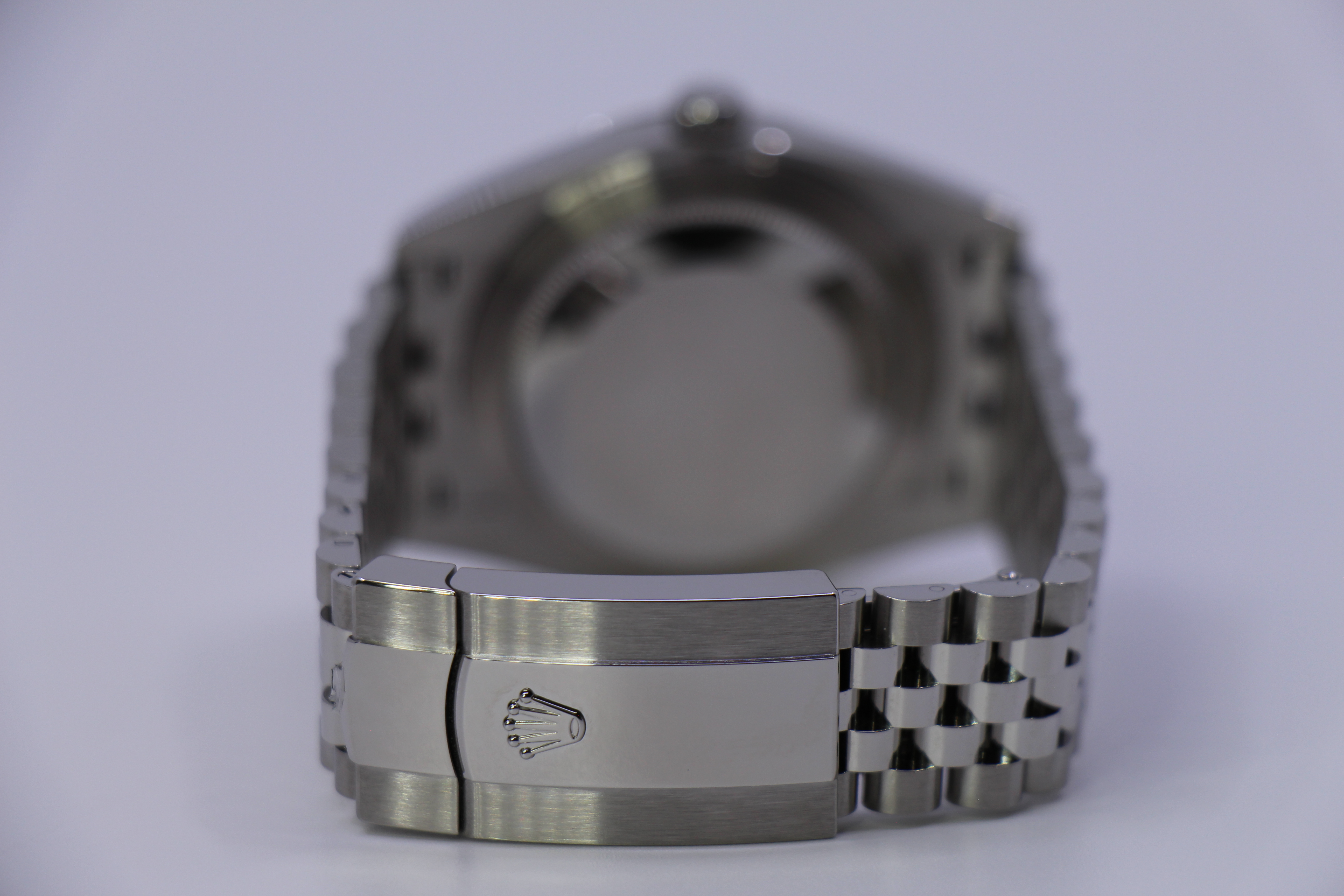Den klassiske Datejust 41, med den klassiske rhodium skive. Her også med en riflet hvidgulds lynette. Uret er monteret på jubilee lænke.
