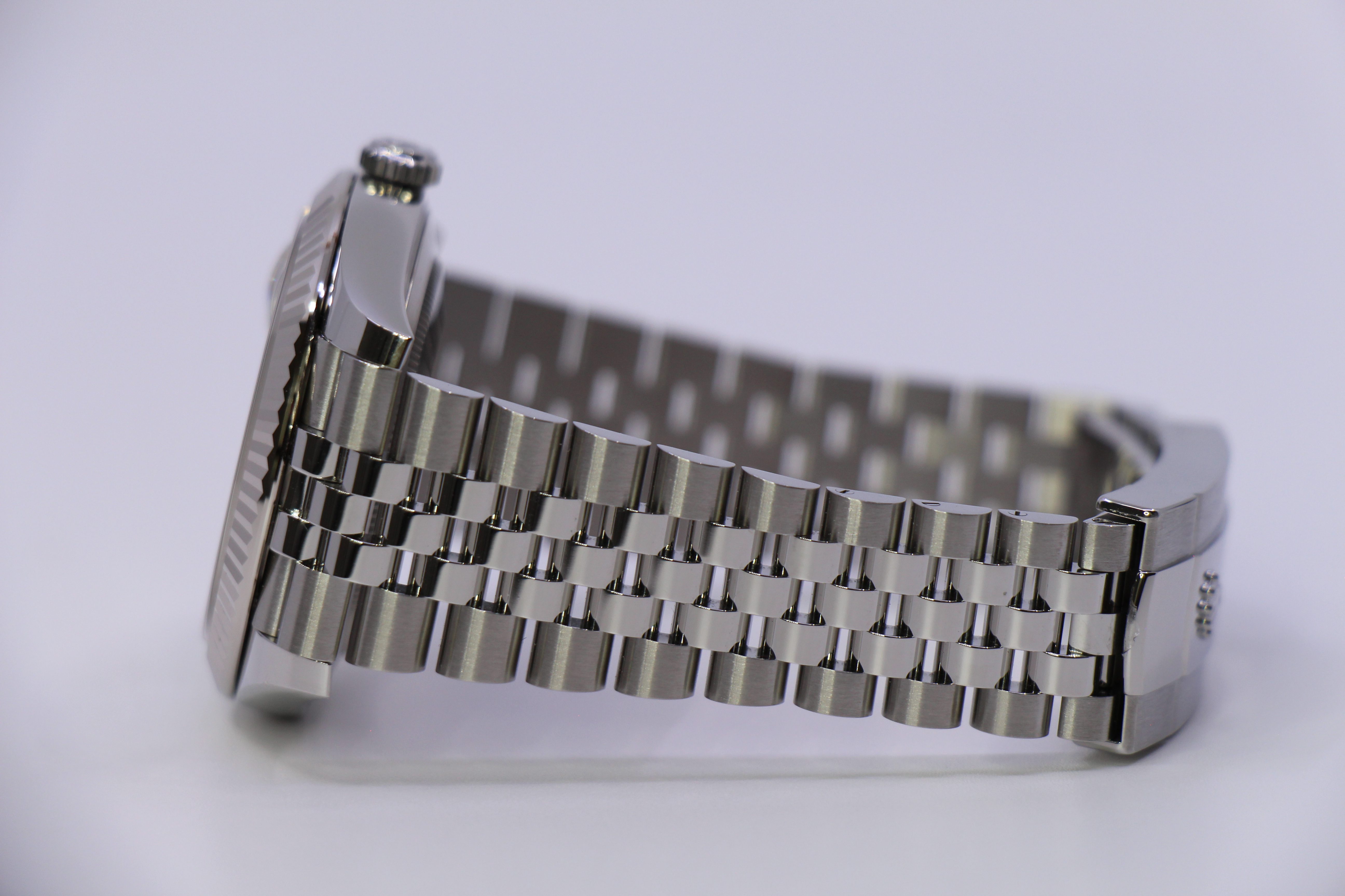 Den klassiske Datejust 41, med den klassiske rhodium skive. Her også med en riflet hvidgulds lynette. Uret er monteret på jubilee lænke.