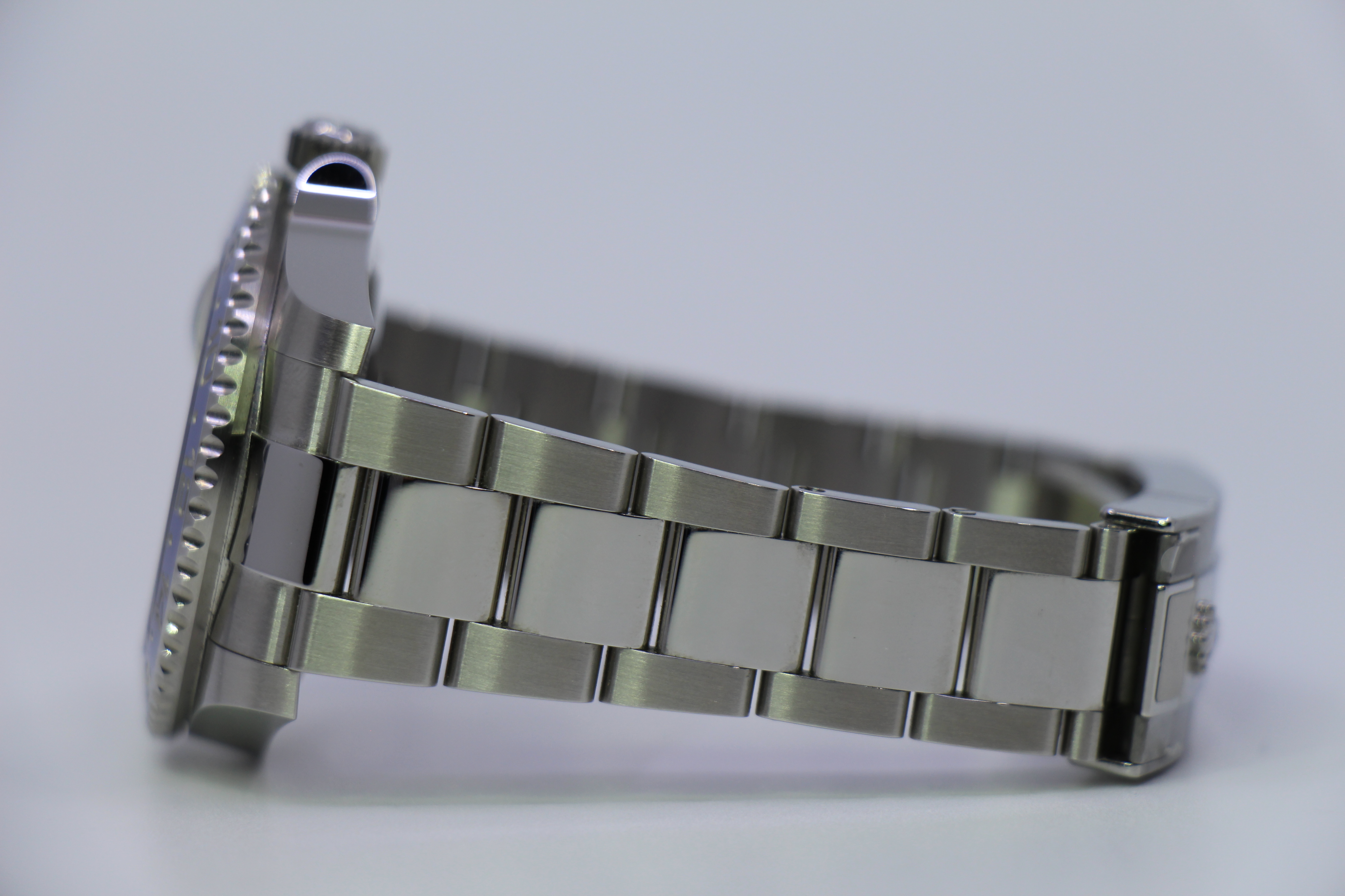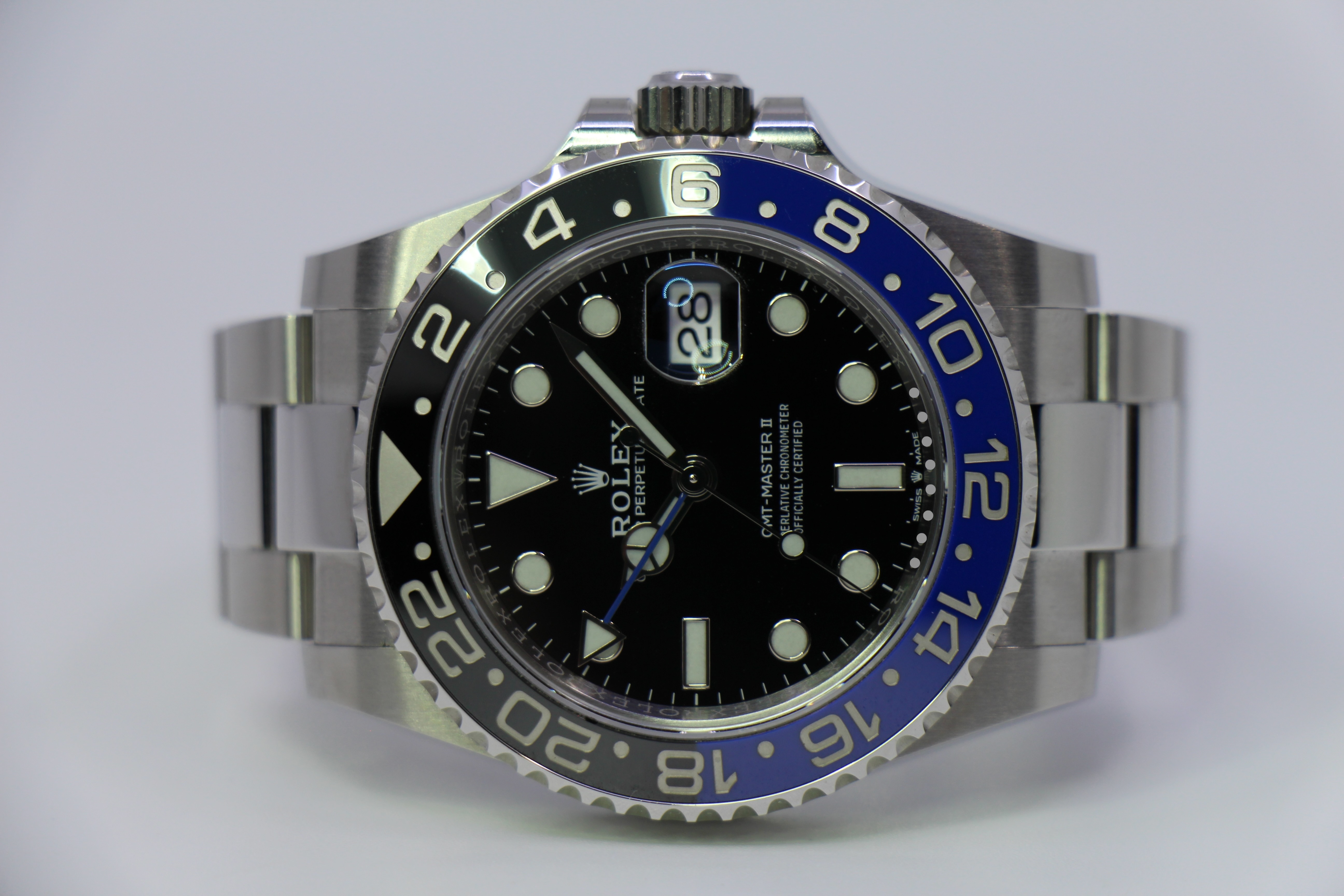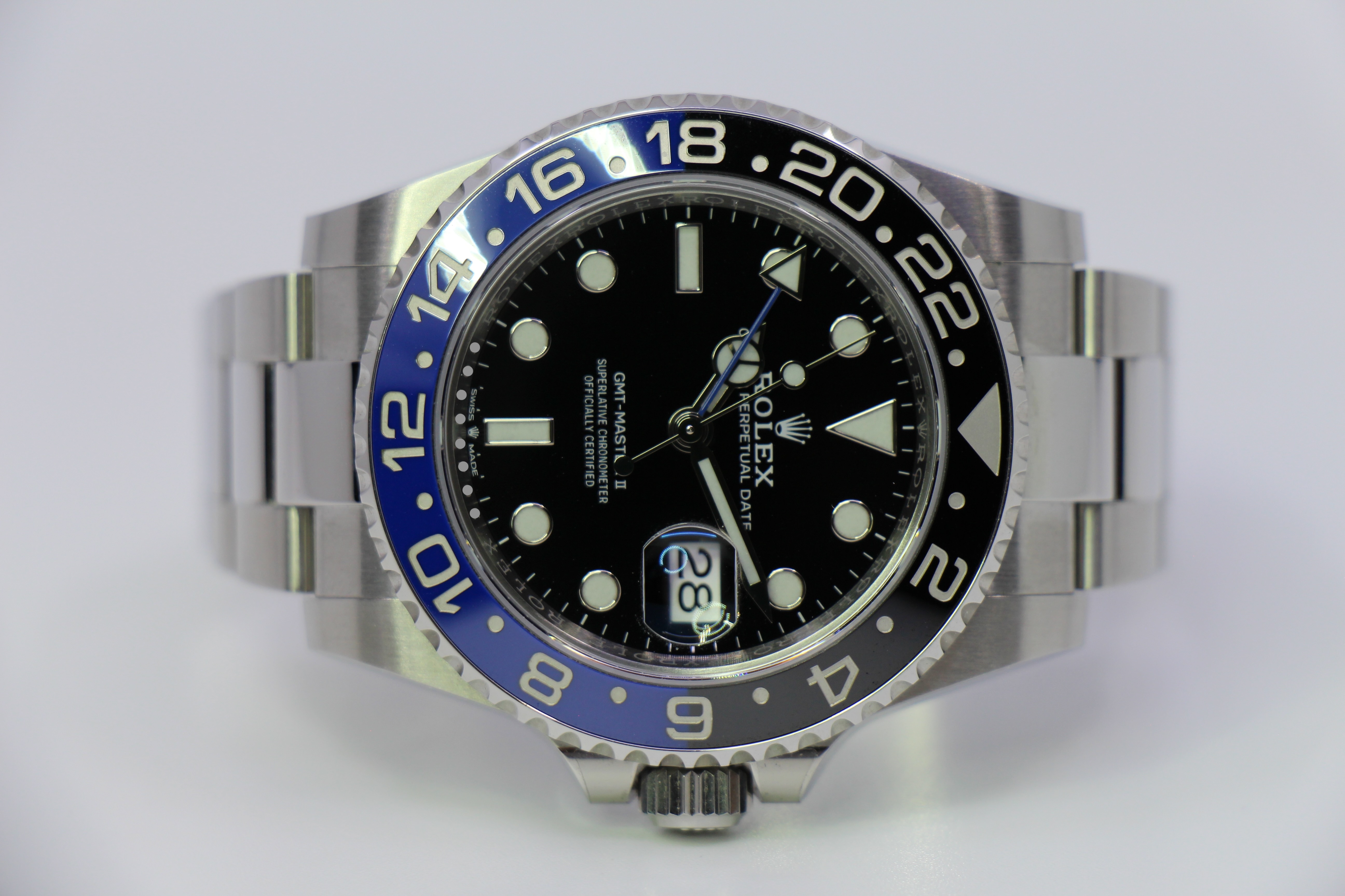 Den nyeste version af GMT – Master II “Batman”. 126710BLNR på oyster lænke udkom på Baseworld i 2021. Uret er monteret på oyster lænke med keramisk insert i blå og sort.