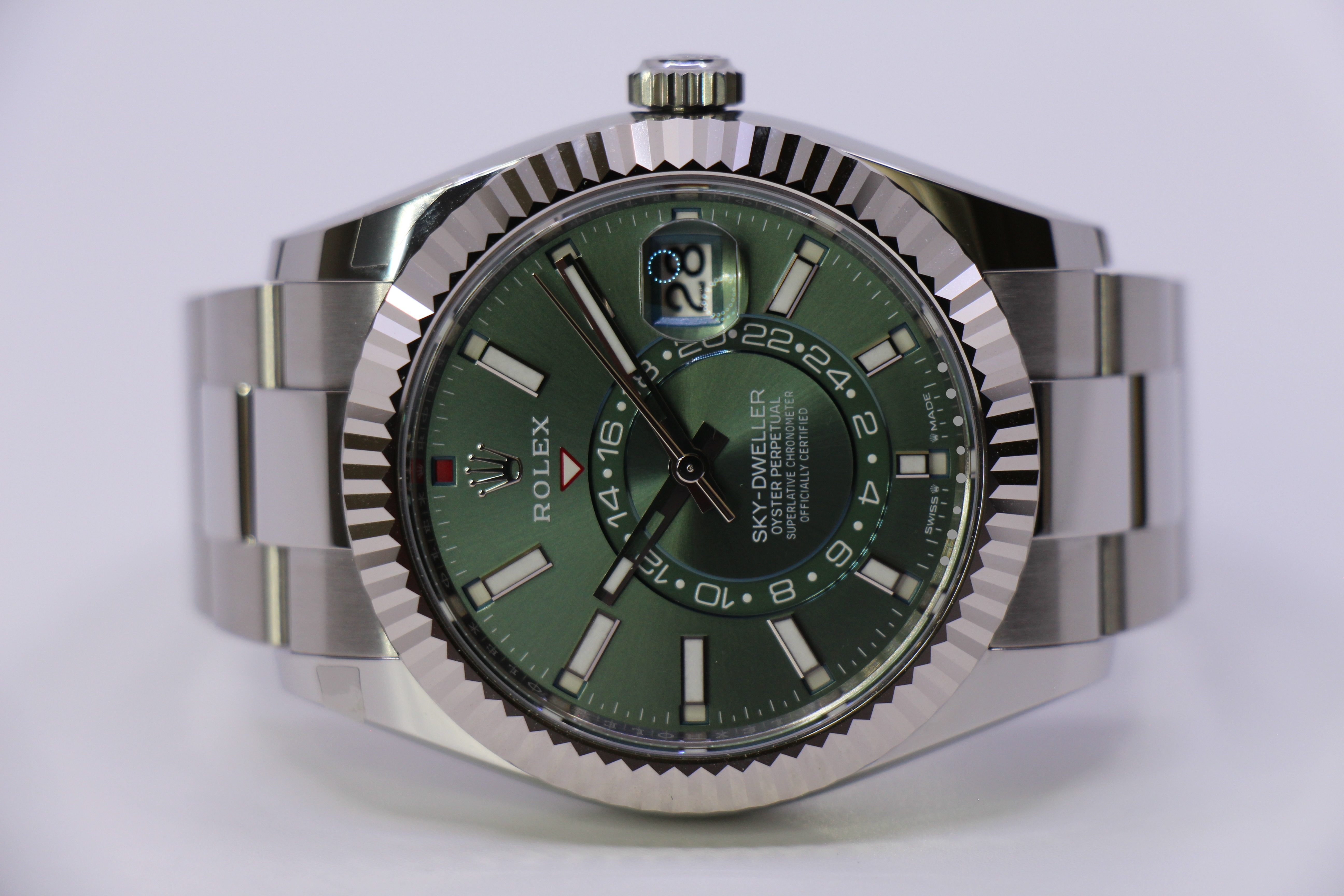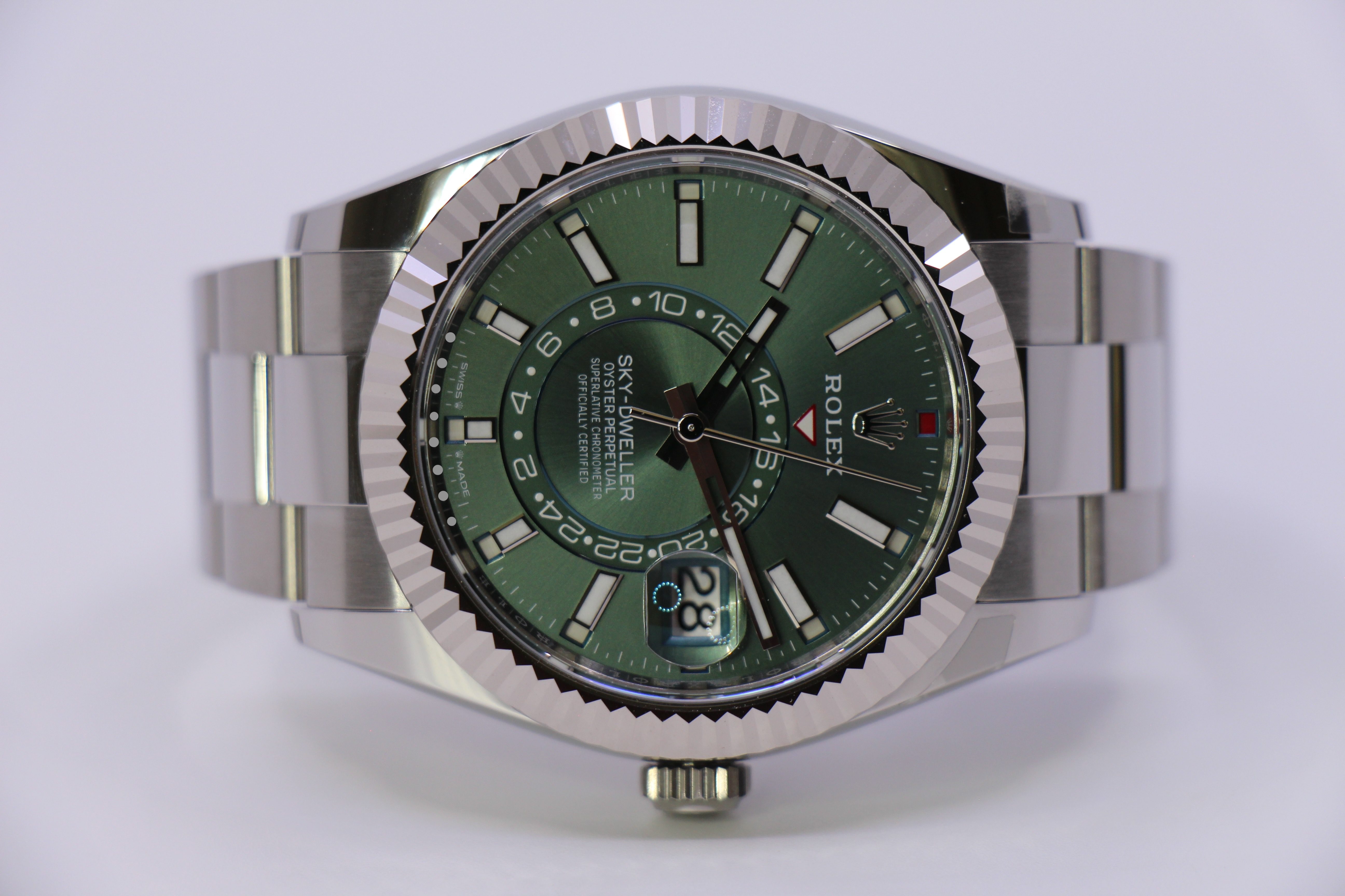 Det nyest lancerede Rolex Sky-Dweller med grøn skive. Uret er i rustfritstål & kommer med en hvidgulds krans.