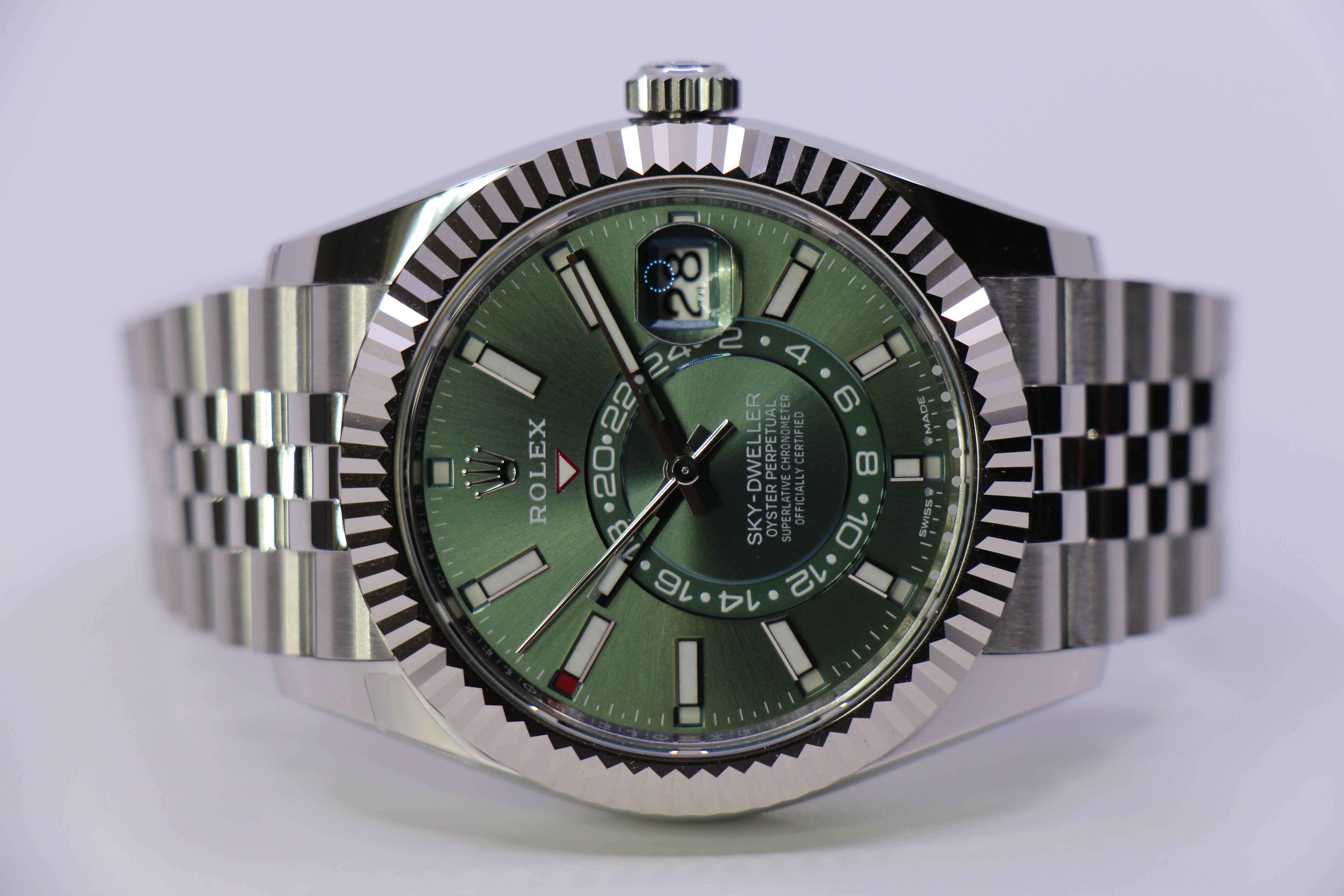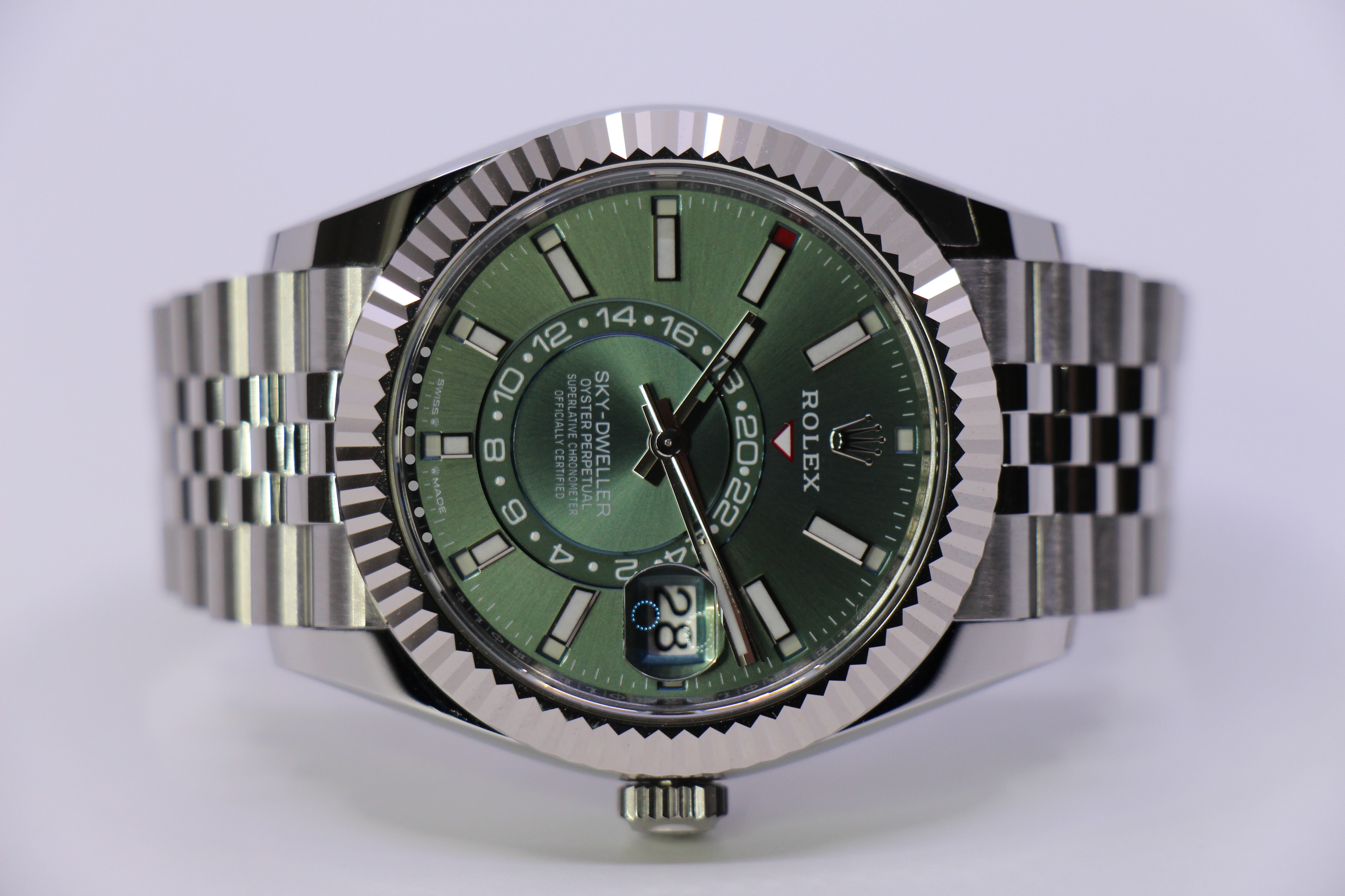 Det nyest lancerede Rolex Sky-Dweller med grøn skive. Uret er i rustfritstål & kommer med en hvidgulds krans.