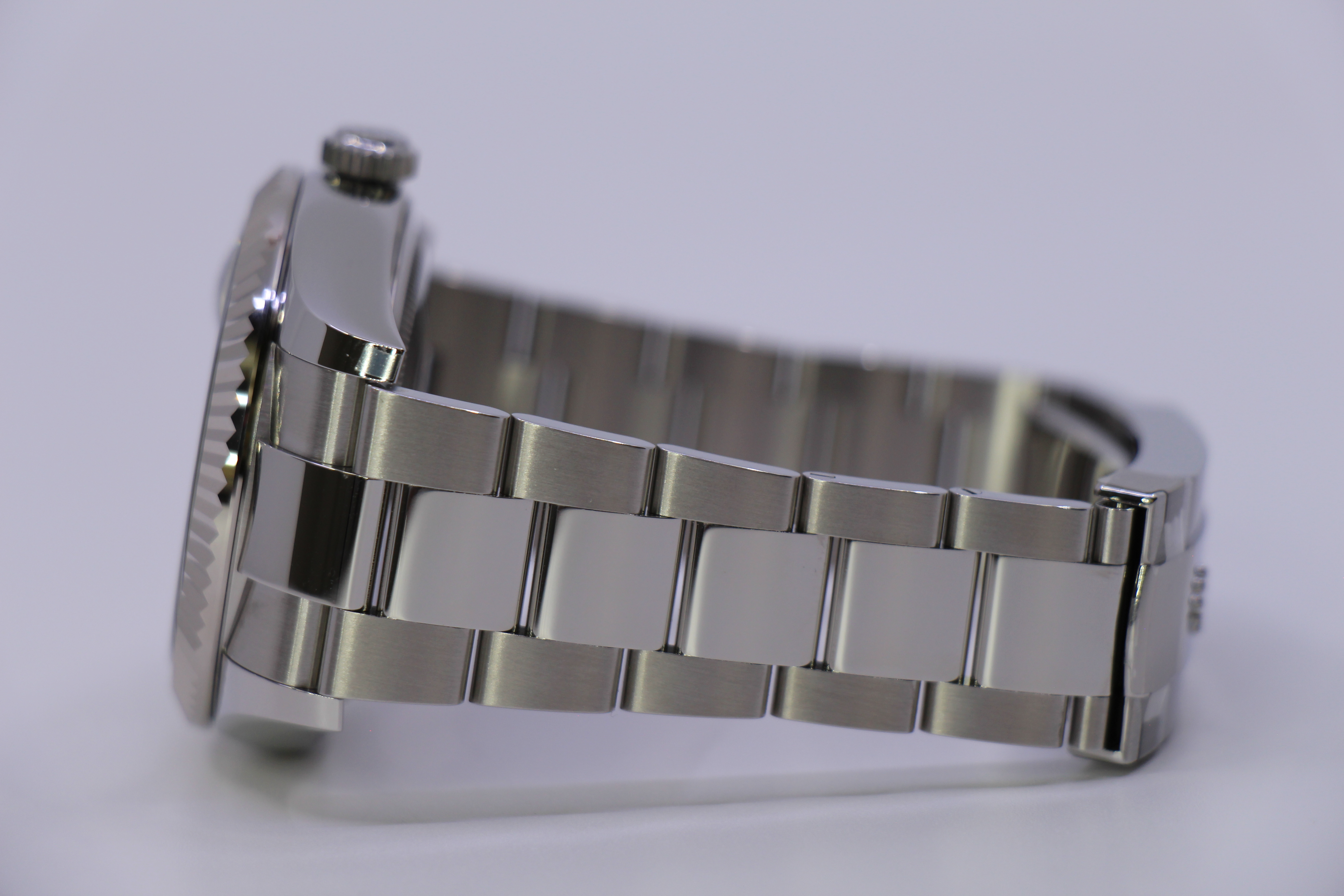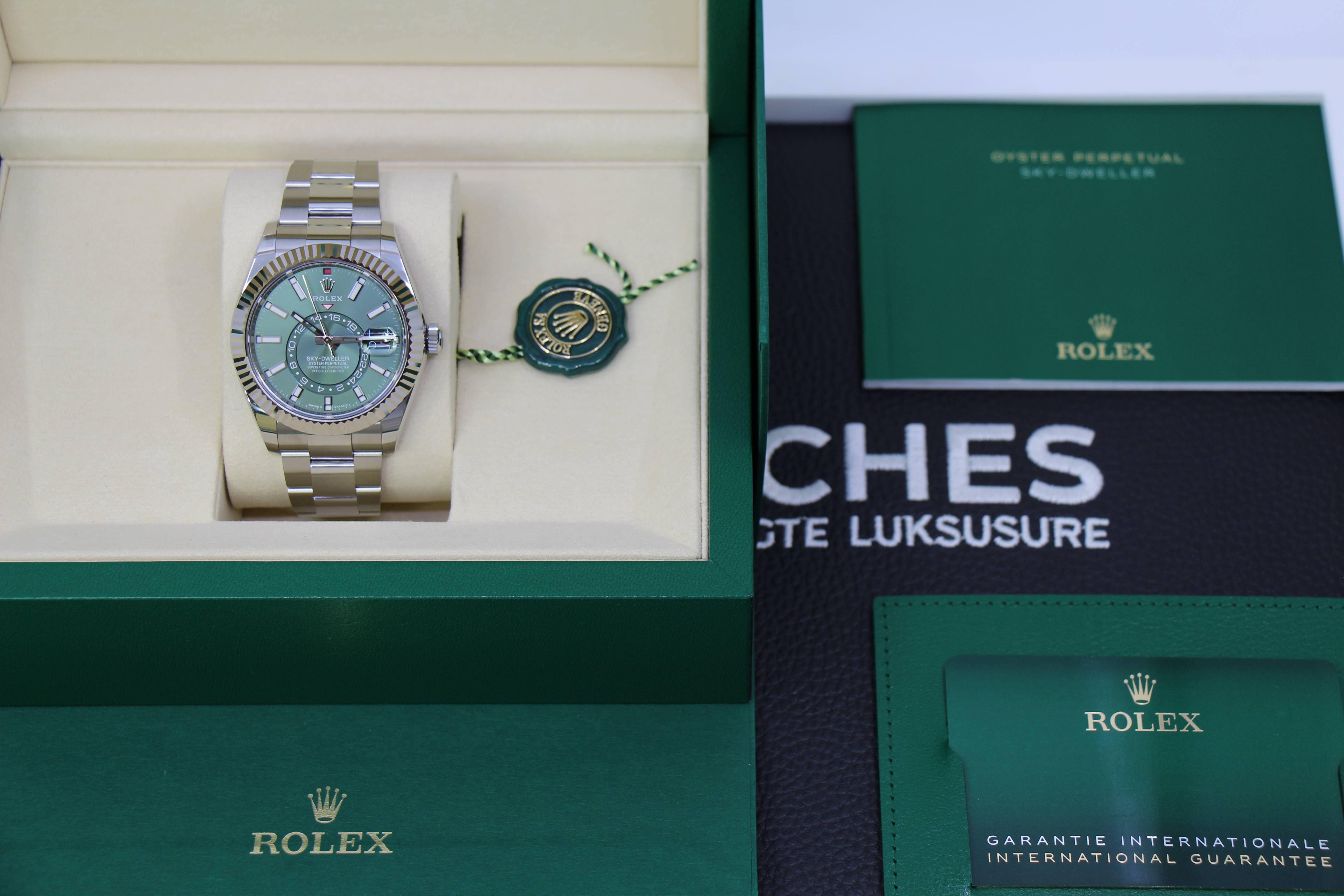 Det nyest lancerede Rolex Sky-Dweller med grøn skive. Uret er i rustfritstål & kommer med en hvidgulds krans.