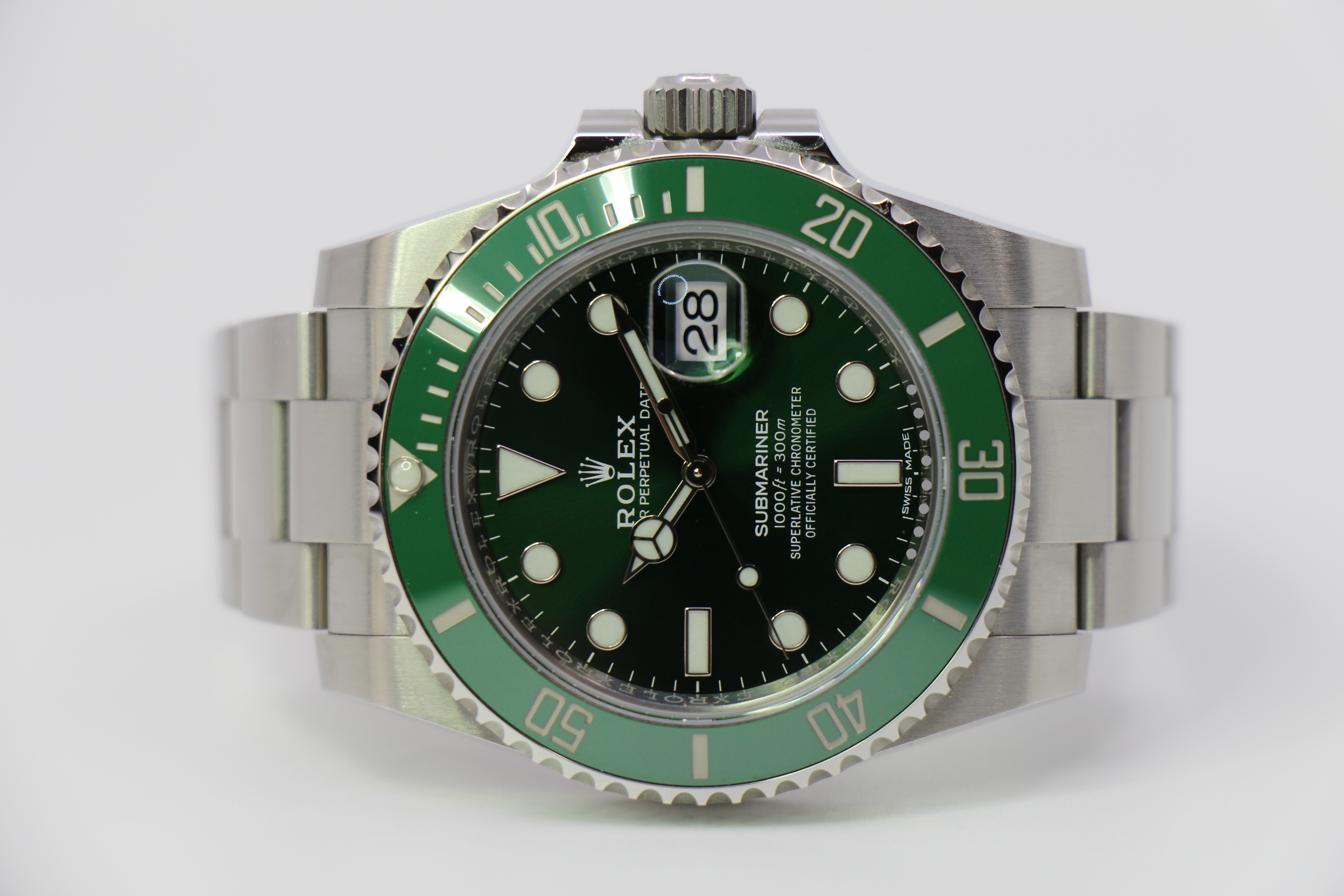 Den klassiske Submariner Date – som her kommer med den populære grønne skive. Uret er udgået af produktionen hos Rolex.