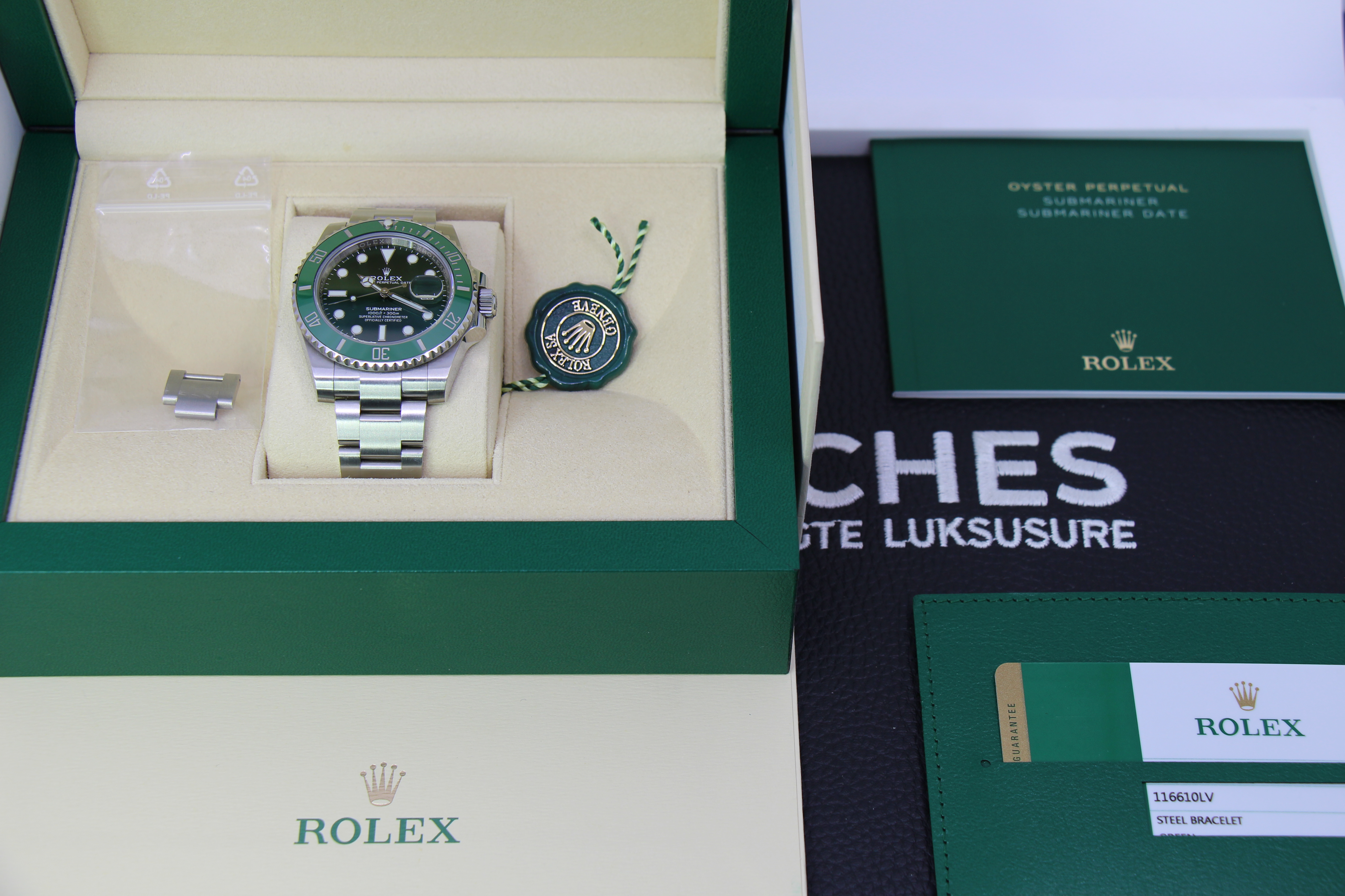 Rolex Submariner Date, ref. 116610LV fra september 2019. Uret har derfor Rolex garanti verden over til september 2024. Uret er i flot stand. Oprindeligt solgt fra Italiensk officiel Rolex forhandler.
