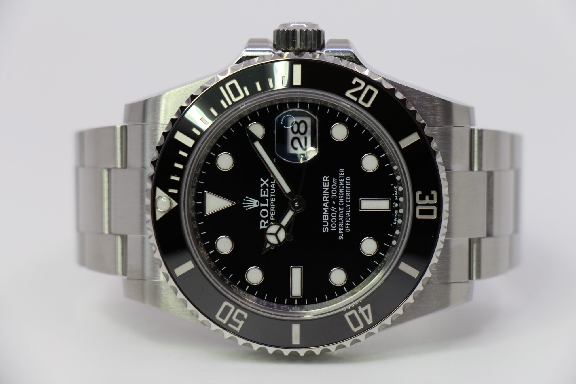 Den klassiske Submariner Date – Her Rolex’ nyeste udgave fra Basel i 2020 med en urkasse på 41mm, her også med hvidguldsmarkeringer, og visere samt keramisk lytte og safirglas.