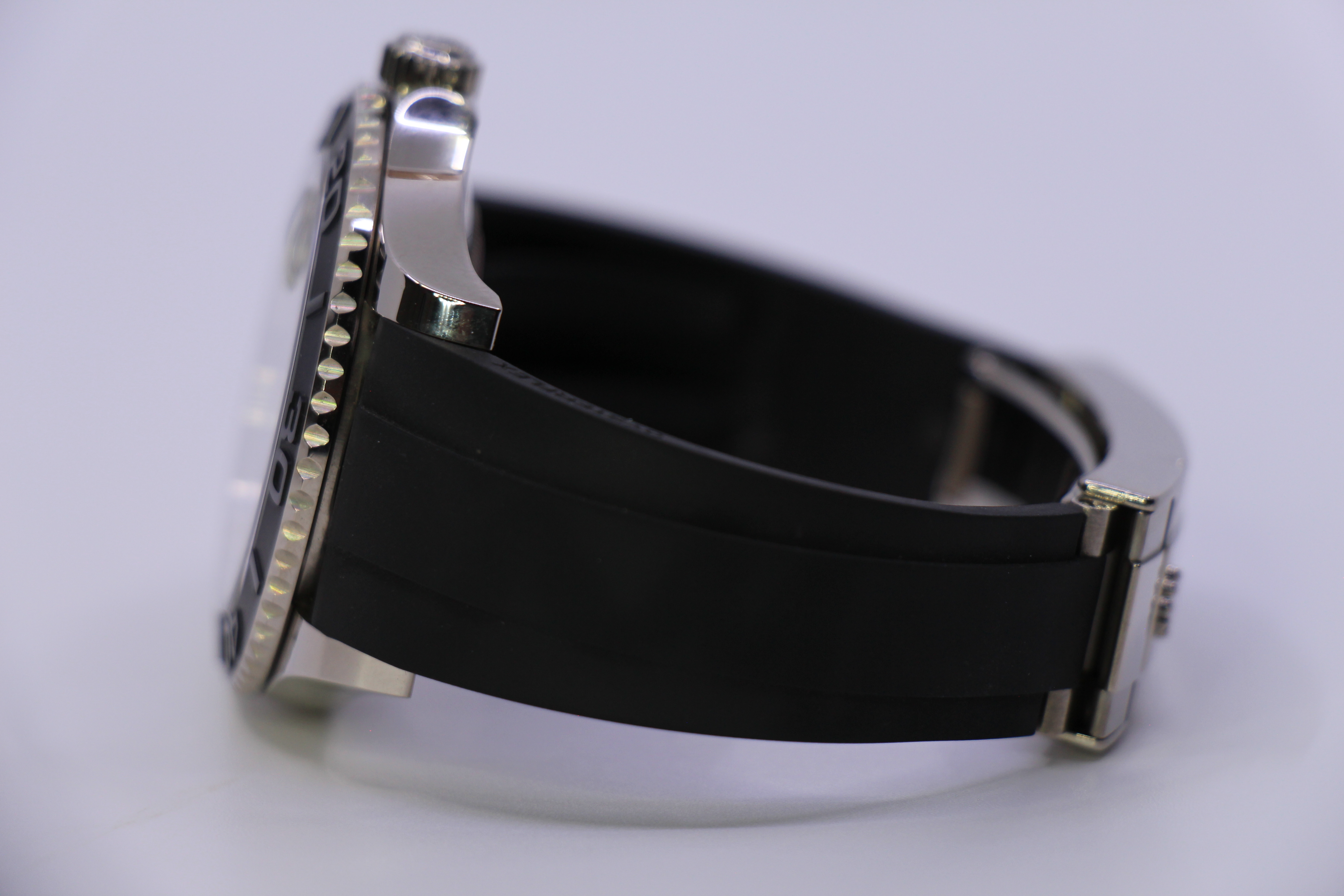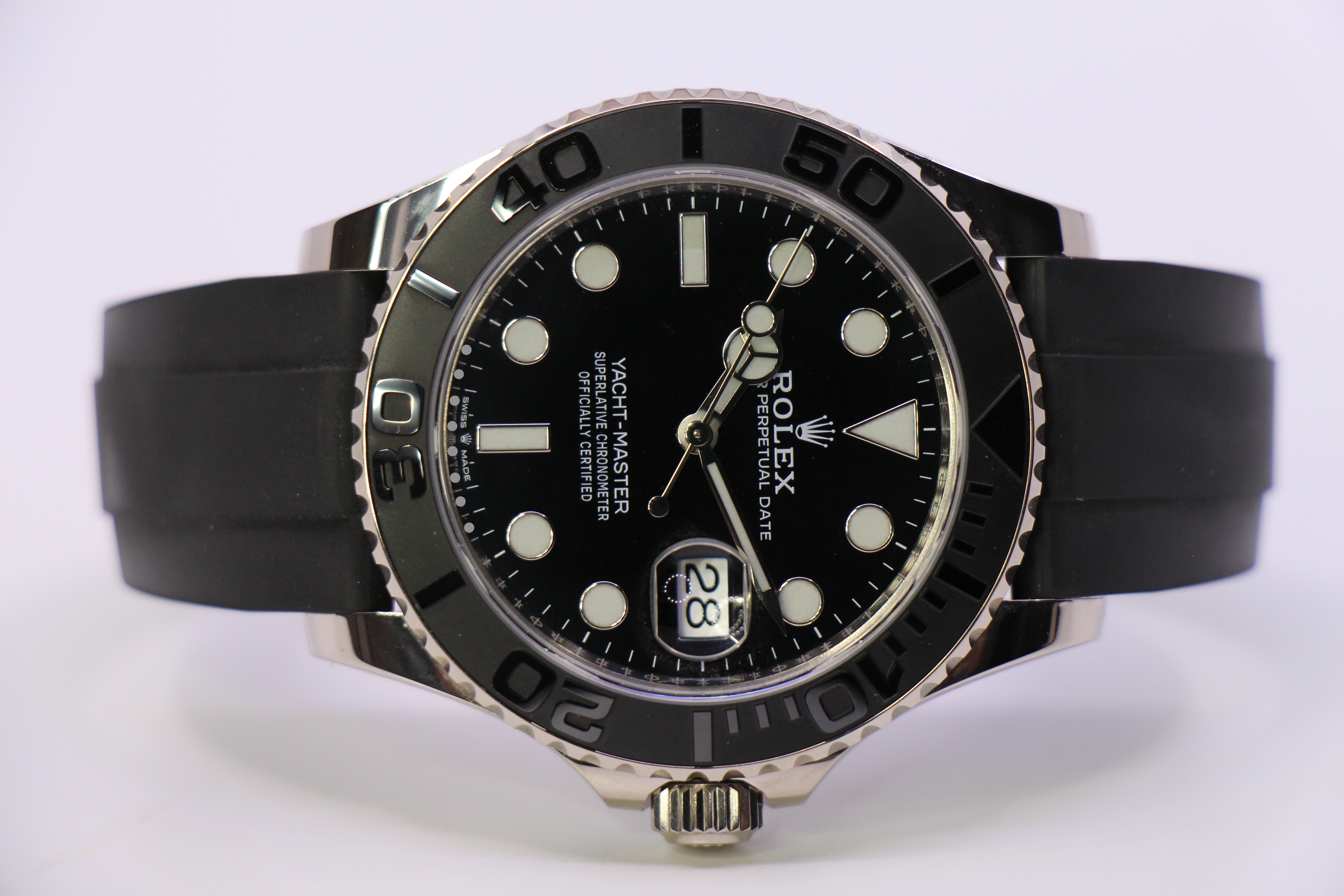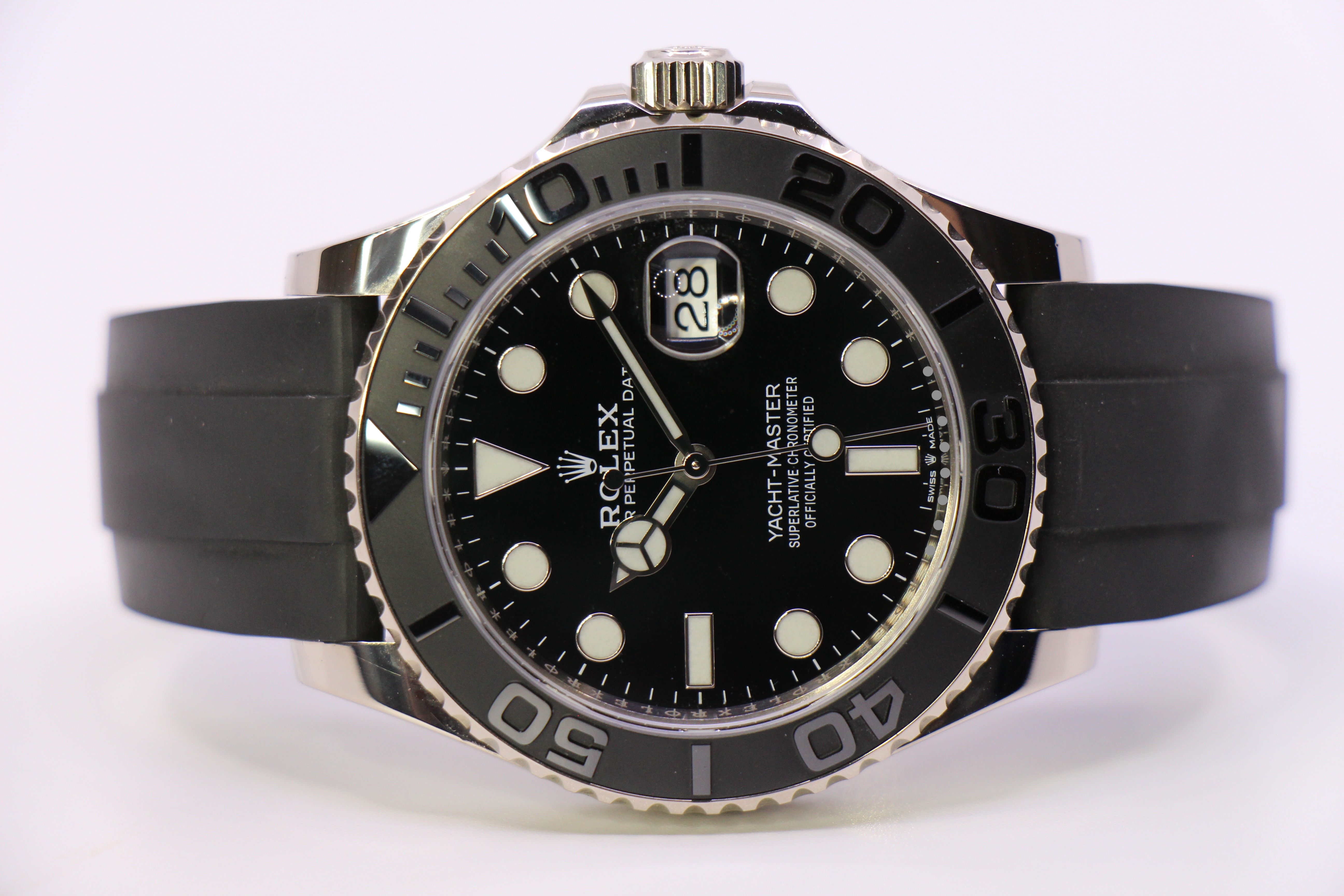 Mega flot Yacht-Master på Oysterflex rem. Uret er udført i 18 karat hvidguld, og har en fed keramisk sort lynette.